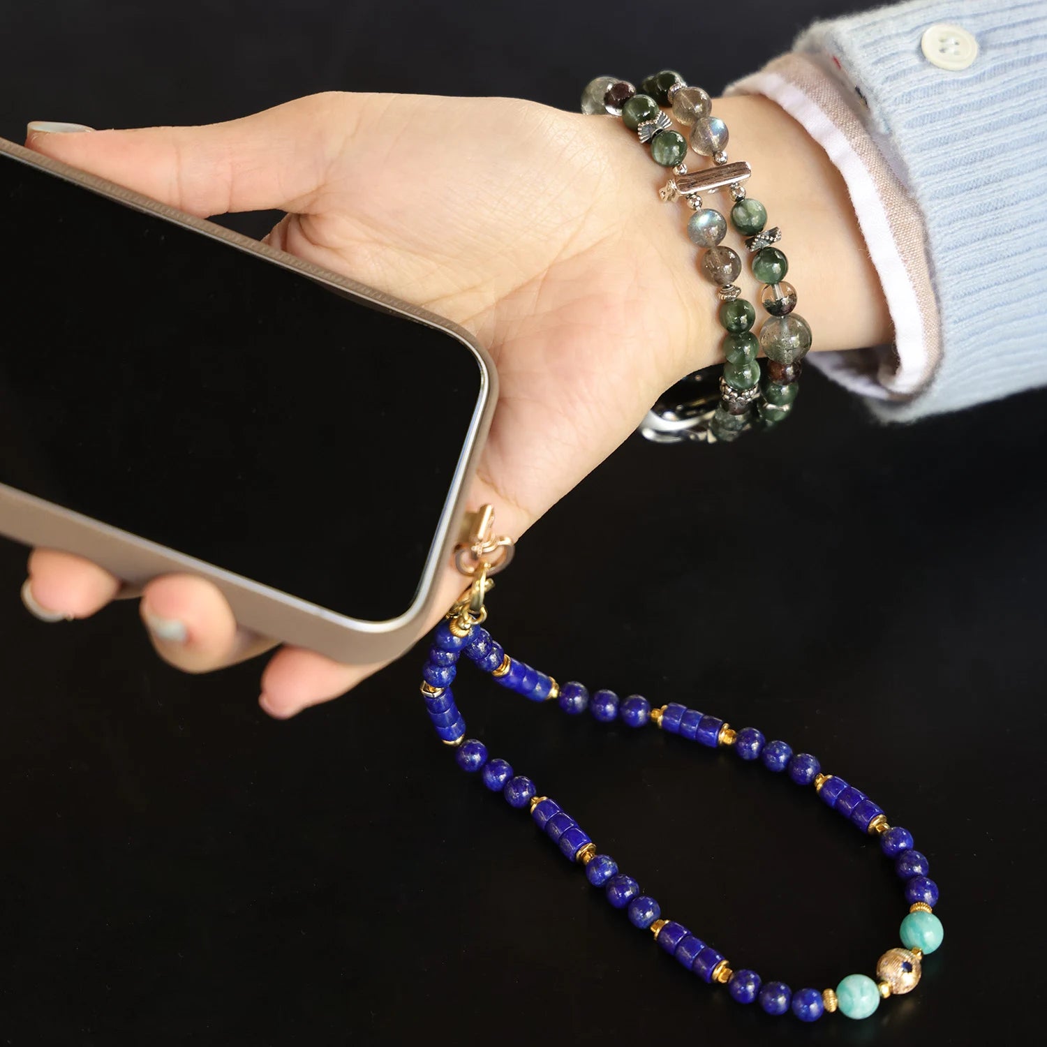 يجمع سوار ساعة أبل المصنوع يدويًا بين حجر الأمازونيت الهادئ ولآلئ سواروفسكي المتلألئة، مع تفاصيل معدنية مرصعة بالكريستال. صُمم السوار على شكل سوار مجوهرات مزدوج الطبقات، ليعكس أناقة راقية وأنوثة خالدة.
