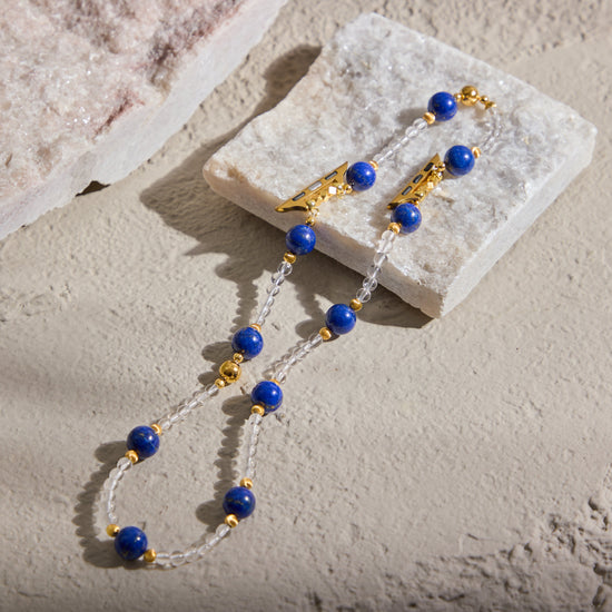 The interplay of translucent white and profound midnight blue creates a visual rhythm that is both serene and powerful—White Quartz, known as the “master healer,” radiates clarity and harmony, while Lapis Lazuli, long revered in Eastern traditions as the stone of wisdom and truth, symbolizes spiritual depth and noble strength.