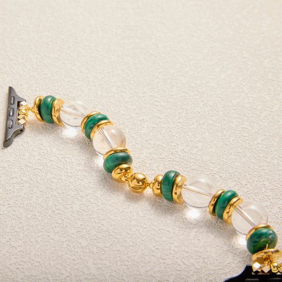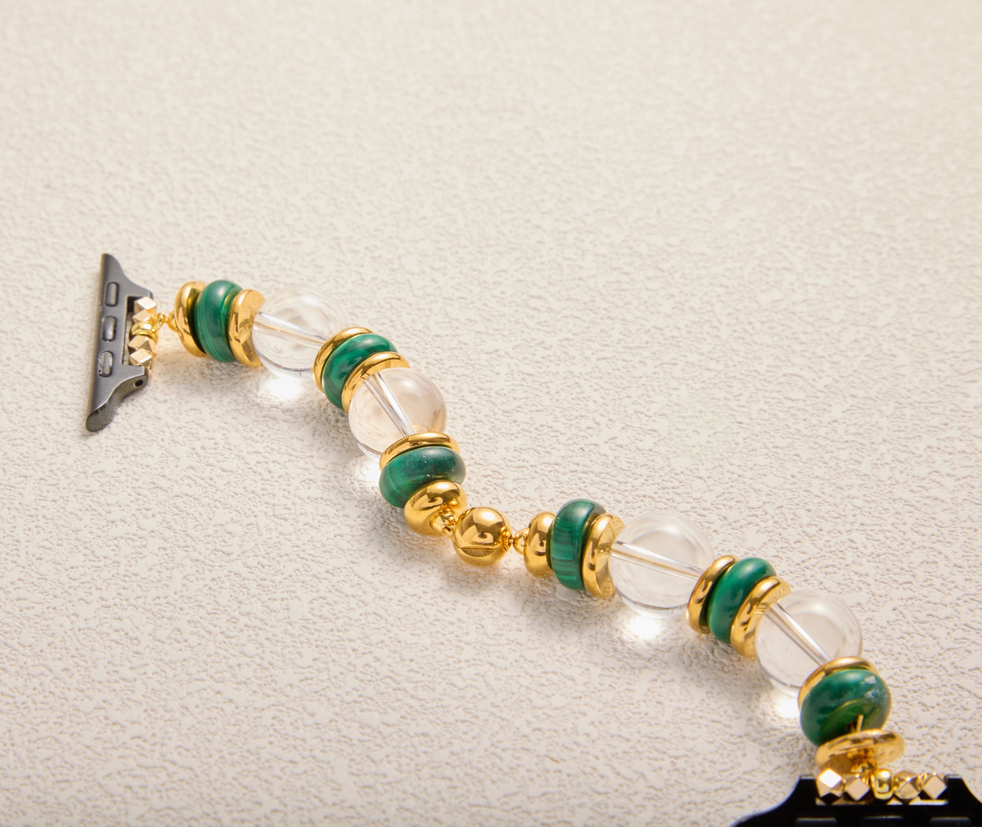 This refined band combines 8mm malachite,and 8–12mm clear quartz with 14K gold-plated detailing. Smoky quartz grounds and stabilizes, malachite inspires transformation, and quartz amplifies clarity. The trio symbolizes balance between earth and spirit—strength, wisdom, and calmness woven into one design. Ideal for those seeking elegance with inner strength.