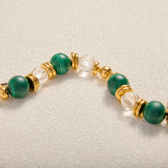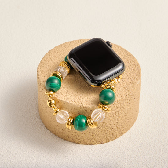Crafted with 8mm malachite beads and 8–12mm clear quartz beads, this design is enhanced by luminous 14K gold-plated accents. Malachite, the deep green “Stone of Transformation,” is revered for its protective and balancing properties. Clear quartz, known as the “Master Healer,” brings clarity, focus, and amplification of energy. Together, they create a harmonious balance of vitality and serenity, transforming your Apple Watch into both a jewel and a talisman.